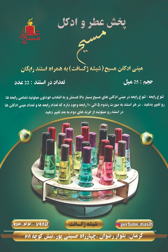 مینی ادکلن های مسیح از بهترین برند های روز دنیا که در زمینه ی تولید اسانس و پرفیوم فعالیت میکنن ساخته شده که به شما حس خوش بویی رو القا میکنه و با ماندگاری بالا شمارو از عطر و ادکلن های دیگه بینیاز میکنه . با مینی ادکلن های مسیح میتوانید همیشه احساس خوبی رو برای خود و اطرافیانتون ایجاد کنید و شعار ما : (عطرت رو تغییر بده زندگیت تغییر میکنه ) مشخصات کلی استند مینی ادکلن های مسیح : 1.دارای 11 راحیه ی متنوع و خوشبو پر فروش 2.مناسب برای فروشگاها-آرایشی بهداشتی ها-عطر فروشی ها-هایپر مارکت ها و... 3.دارای استند چوبی شکیل و مناسب (رایگان) 4.دارای شیشه های با کیفیت پاشش خوب و طراحی جالب 5.ماندگاری خوب نسبت به قیمت و دیگر رقبا 6.سازگاری با هر نوع سلیقه ای 7.ارسال سریع به سراسر ایران 8.تعداد مینی ادکلن ها در استند 22عدد